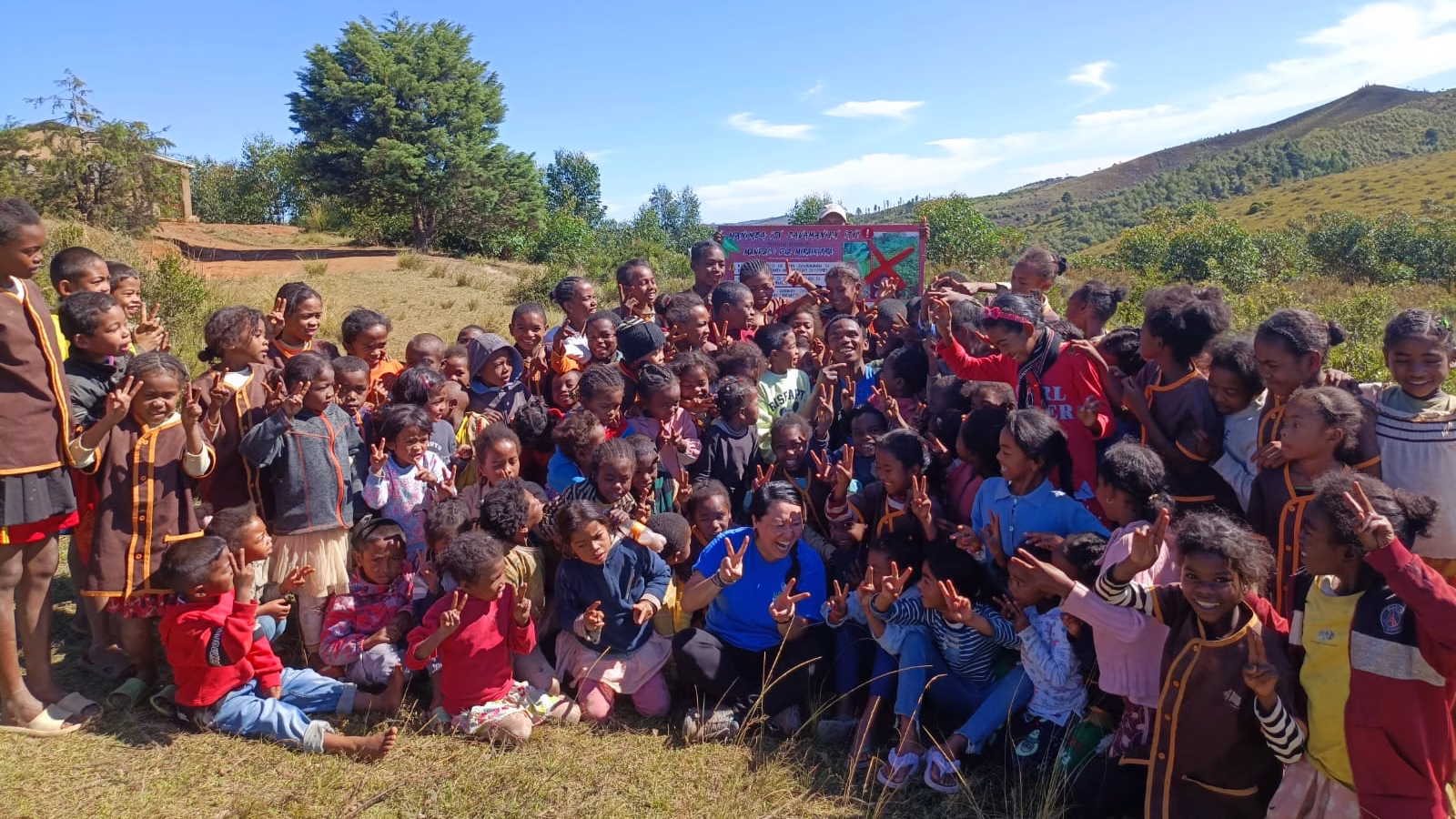 Domohina and Joany made the lesson fun. The kids laughed and repeated things like a song, then made love hearts with their hands. After the lesson, the kids went outside to play, posed for photos and jumped in for a group photo, holding up the poster I made.