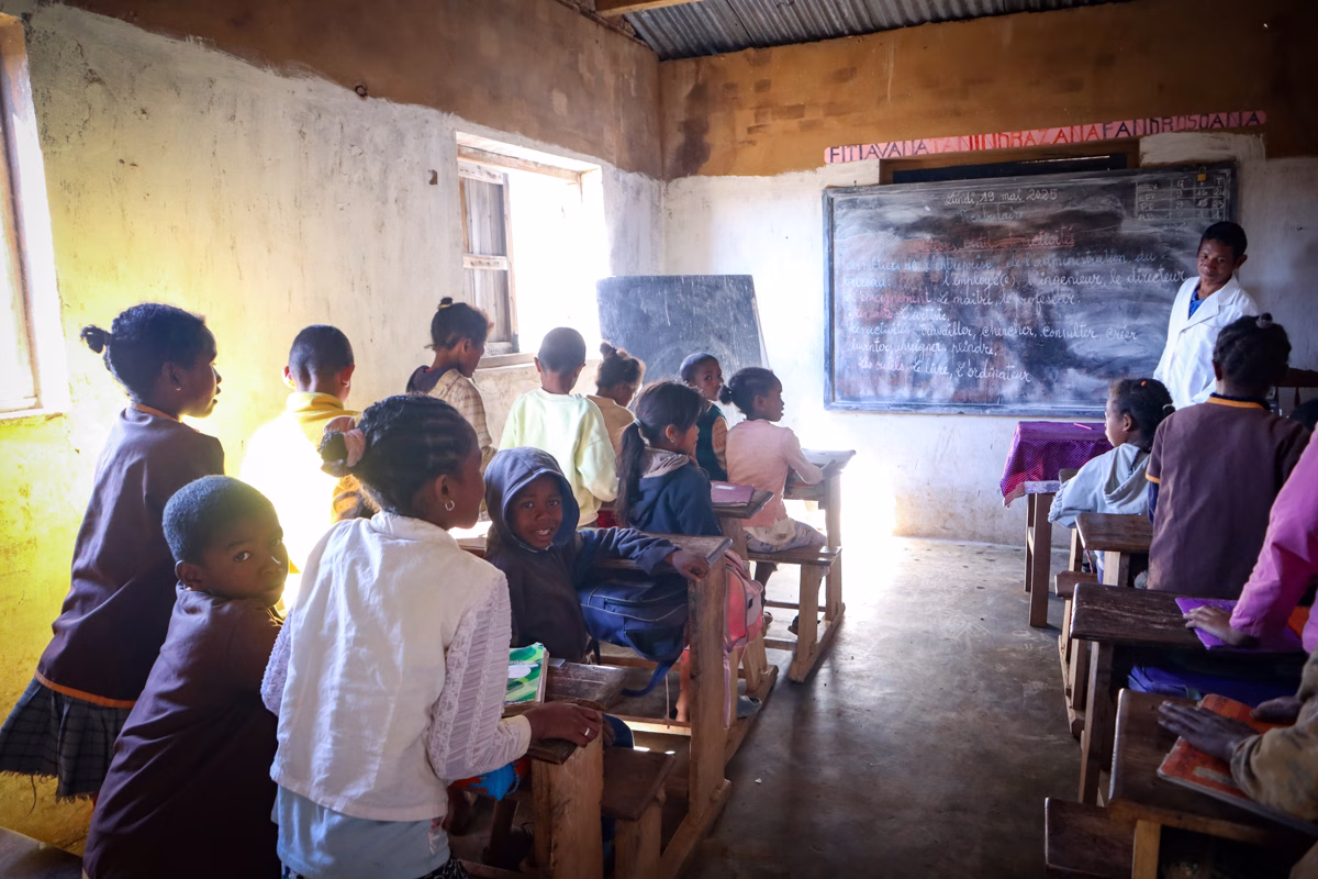 Domohina and Joany were taking me to the village and they both wore slides, but I wore full hiking boots—and I was glad I did! The terrain changed from dirt roads to muddy, steep hills, avoiding zebu poop, balancing across water-logged ledges, puddles, and logs. It was also very hot, a massive change from the rainy cold days before. The school was way up many hills, and when we finally reached the shade, it felt like a miracle.