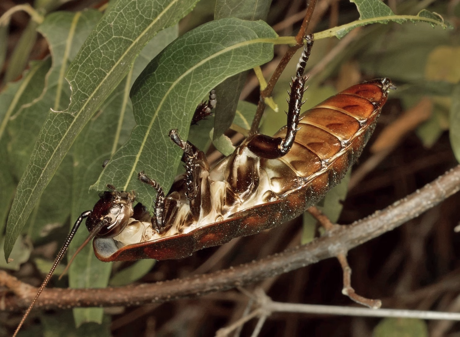 Hissing cockroaches spend most of their time on the forest floor, hanging out in rotting logs, leaf litter, and other detritus. They are nocturnal and tend to avoid light. At night, they become more active and venture out to scavenge for food. Males establish territories that they defend from other adult males. Aggressive hissing and posturing warns potential interlopers away, and its usually the male that is larger and hisses more that wins. One dominance behavior is standing up on their “toes,” which is called stilting. If necessary, the males will fight, tussling and pushing each other with their pronatal humps, although fights rarely result in injury. Female hissing cockroaches, on the other hand, are more social and do not fight with one another or with males.