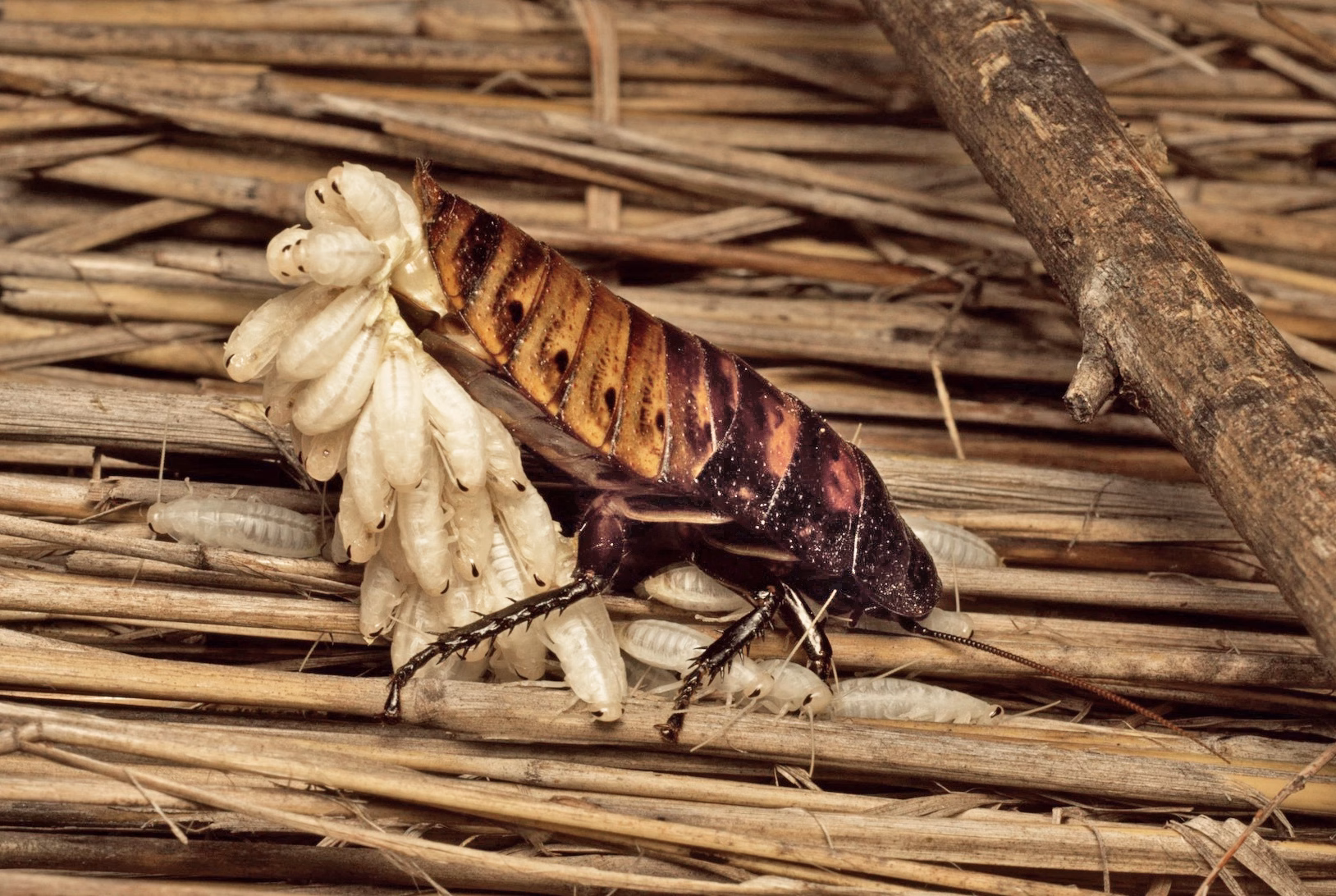 These insects are ovoviviparous, which means that the female “lays” eggs, but they stay inside her body until they hatch. She then releases the offspring, called nymphs, which will grow and molt before they are fully developed adults.