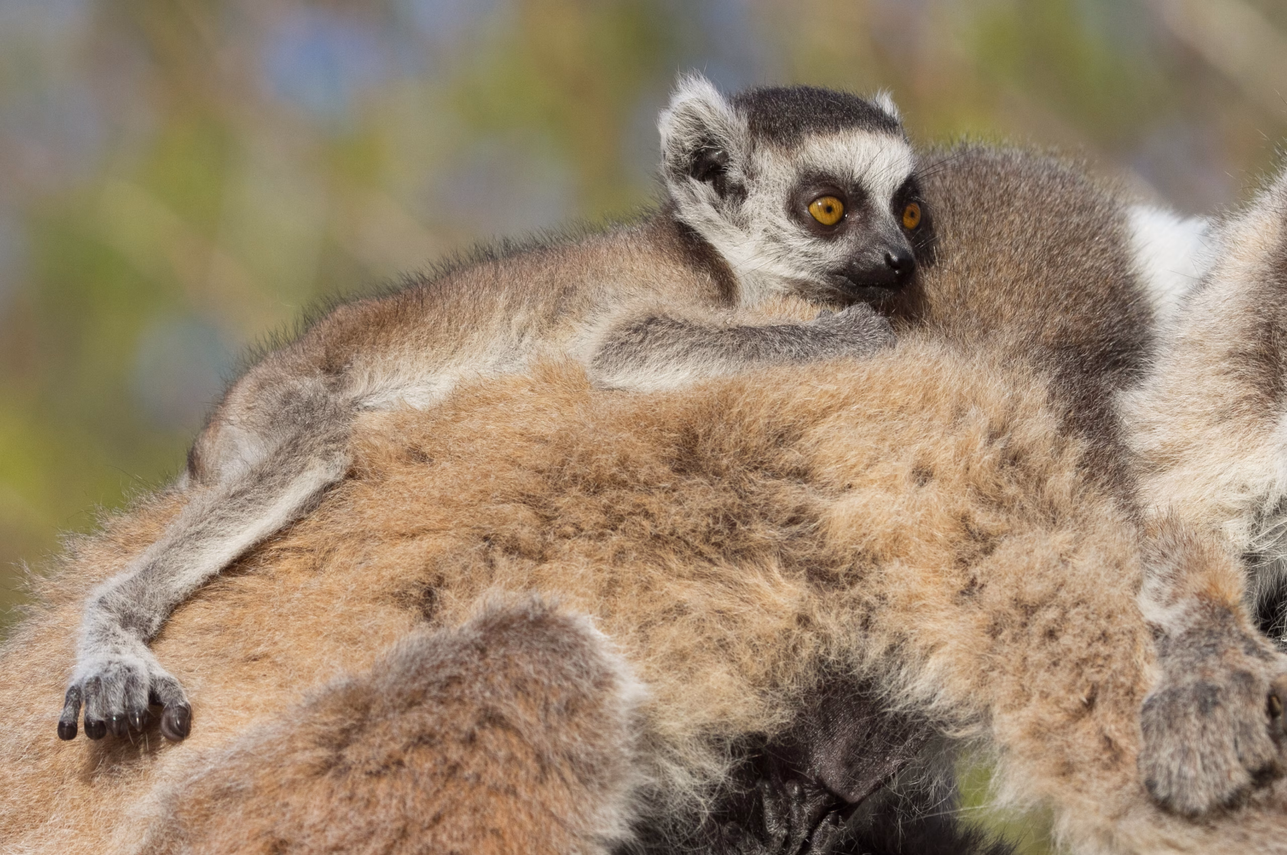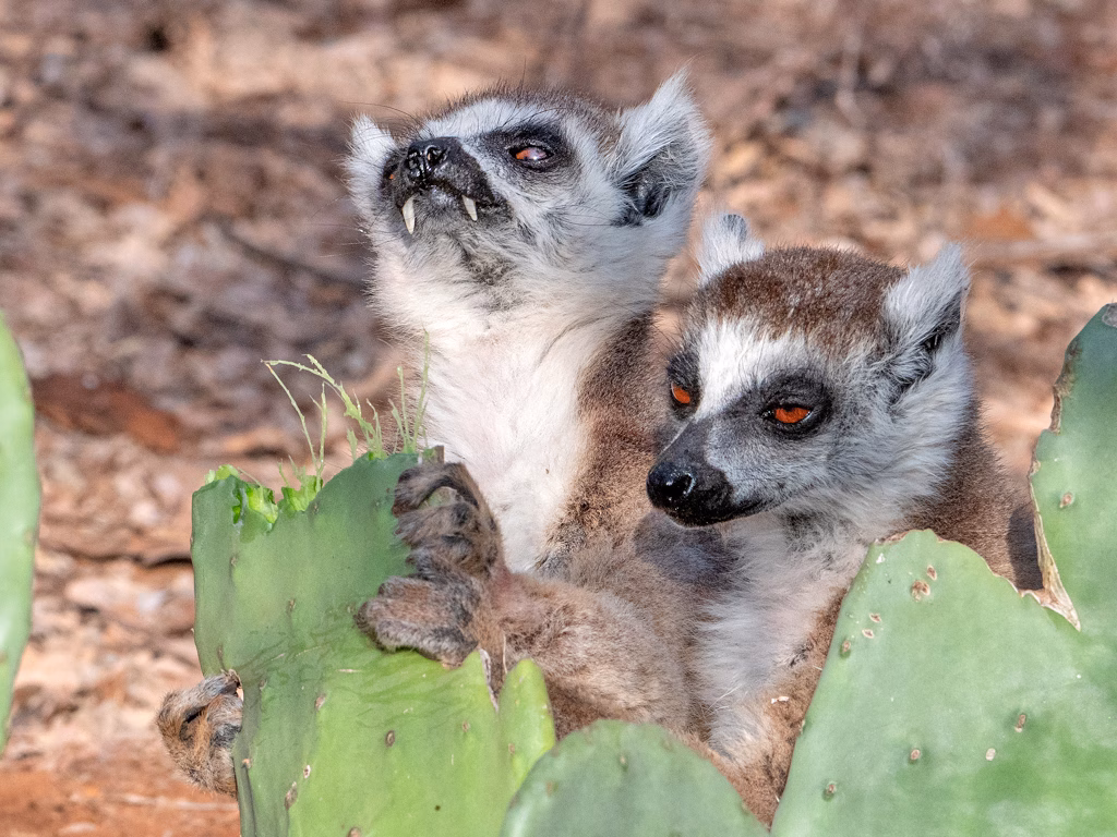 Scent marking is an important part of their communication, identifying individuals, signaling reproduction readiness, and even indicating illness or stress. Females have only one set of scent glands, but males have three, including on their wrists and chest. Males use their pungent scents to engage in “stink fights,” in which two lemurs rub scent all over their tails, then flick and fling their tails at each other to see which one out-stinks the other!