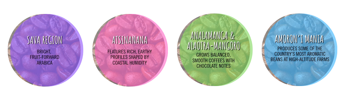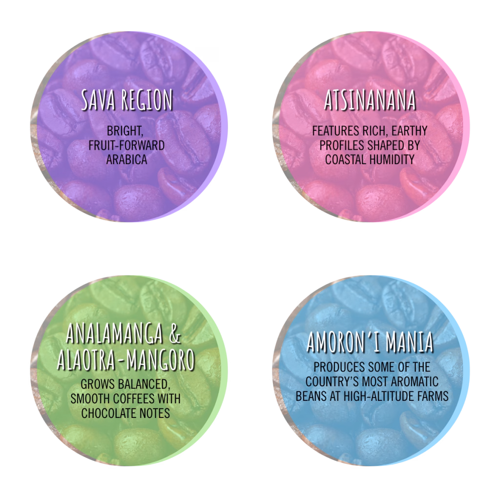 Madagascar’s finest coffee grows along its eastern rainforest corridor and in the highlands, where cool temperatures and volcanic soils create exceptional flavor. Regions such as: